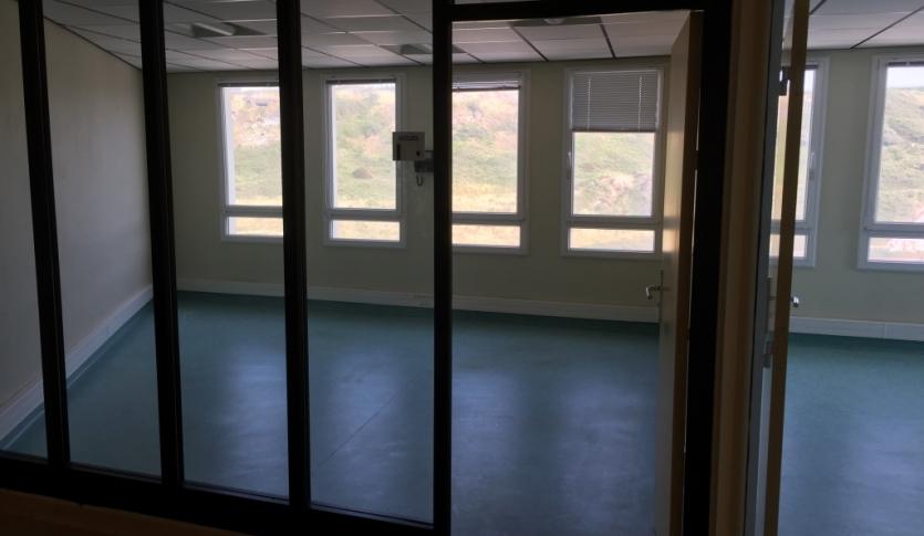 Two furnished offices for rent, measuring 20 m² and 40 m² respectively, on the second floor of the Hoverport building, located in the municipality of Le Portel, next to the beach and on the outskirts of the industrial port area of Boulogne-sur-Mer.